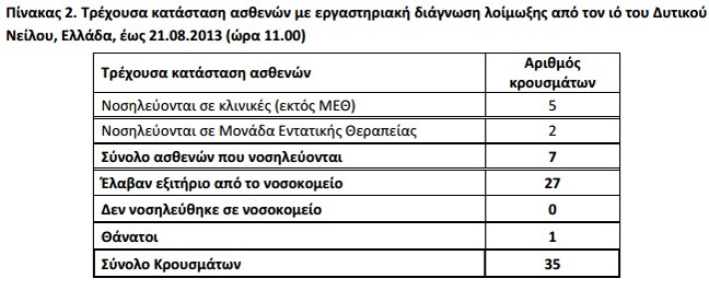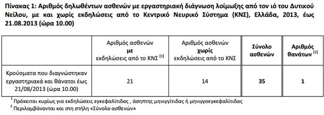 Από τα 35 κρούσματα, τα 21 παρουσίασαν εκδηλώσεις από το Κεντρικό Νευρικό Σύστημα (εγκεφαλίτιδα- μηνιγγίτιδα), ενώ τα υπόλοιπα 14 είχαν ήπιες εκδηλώσεις. Εξακολουθούν να νοσηλεύονται τρία άτομα σε κλινικές και δύο σε Μονάδες Εντατικής Θεραπείας.