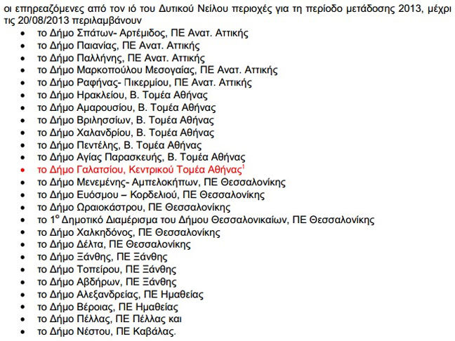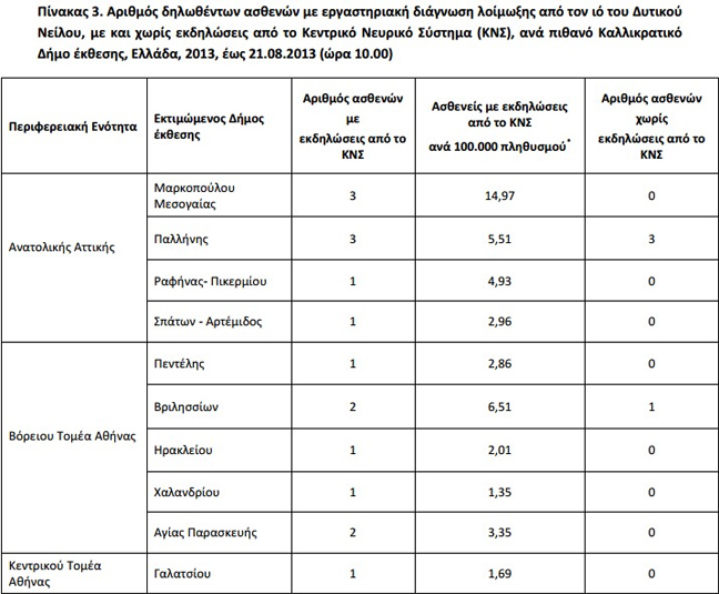 Σύμφωνα με τα στοιχεία του Κέντρου Ελέγχου και Πρόληψης Νοσημάτων (ΚΕΕΛΠΝΟ), ο αριθμός των κρουσμάτων με λοίμωξη του ιού του Δυτικού Νείλου ανέρχεται σε 35, με τα περισσότερα να καταγράφονται στην Αττική και ακολουθούν οι περιοχές της Καβάλας, της Ξάνθης, της Ημαθίας και της Θεσσαλονίκης.