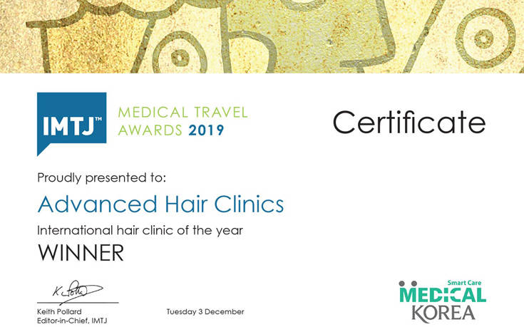 Για τρίτη φορά η εξειδικευμένη κλινική μεταμόσχευσης μαλλιών Advanced Hair Clinics αναγνωρίστηκε και βραβεύτηκε ως International Hair Clinic of the Year από τον διεθνή, μη κερδοσκοπικό οργανισμό International Medical Travel Journal (IMTJ).