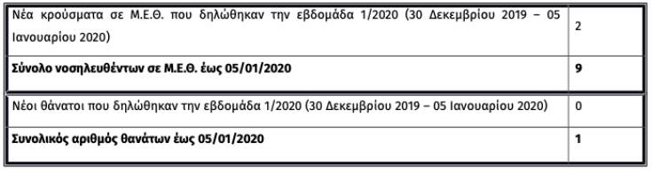 Από την εβδομάδα 40/2019 έως και την εβδομάδα 1/2020 (30 Δεκεμβρίου 2019 – 05 Ιανουαρίου 2020) καταγράφηκαν 9 σοβαρά κρούσματα εργαστηριακά επιβεβαιωμένης γρίπης, με νοσηλεία σε Μ.Ε.Θ. Από το σύνολο των ασθενών αυτών, μόνο 2 (22,2%) είχαν εμβολιαστεί για τη γρίπη, αν και όλοι ανήκαν σε ομάδα υψηλού κινδύνου για την οποία συνιστάται εμβολιασμός σύμφωνα με την σχετική εγκύκλιο του Υπουργείου Υγείας. Το ίδιο χρονικό διάστημα καταγράφηκε ένας θάνατος από εργαστηριακά επιβεβαιωμένη γρίπη σε ασθενή με νοσηλεία σε Μ.Ε.Θ.