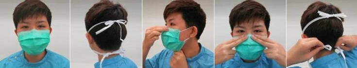 - ασφάλιση με τα κορδόνια στη μεσότητα του πίσω μέρους της κεφαλής και του λαιμού. Εάν πρόκειται για μάσκα με ελαστικούς βρόγχους αυτοί εφαρμόζονται γύρω από τα αυτιά