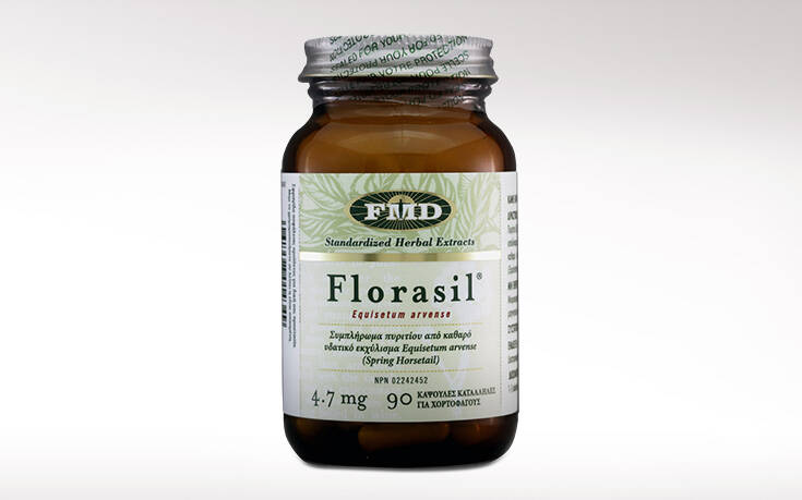 Το Florasil® προσφέρει στον οργανισμό μας οργανικό πυρίτιο, στην πιο αφομοιώσιμη μορφή του και αναπληρώνει την έλλειψη πυριτίου που βρίσκουμε σπανίως στις τροφές σε αφομοιώσιμη μορφή. Προέρχεται από το φυτό Εquisetum Arvense, ανοιξιάτικης συγκομιδής ώστε να περιέχει όλα τα φυσικά φλαβονοειδή που συντελούν στη βιοδιαθεσιμότητά του (προσεγγίζει το 100%) και άλλα 30 και πλέον φυσικώς ευρισκόμενα μέταλλα.