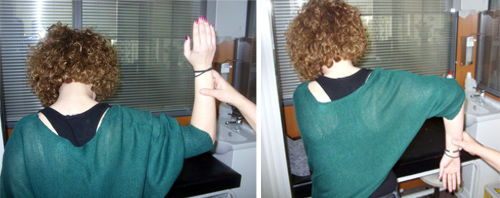 Συγκρατούμε το χέρι στη θέση που τον ανακουφίζει, δηλαδή μακριά από το σώμα του και αρχίζουμε να γυρίζουμε αργά το χέρι προς τα πίσω (προς το κεφάλι).