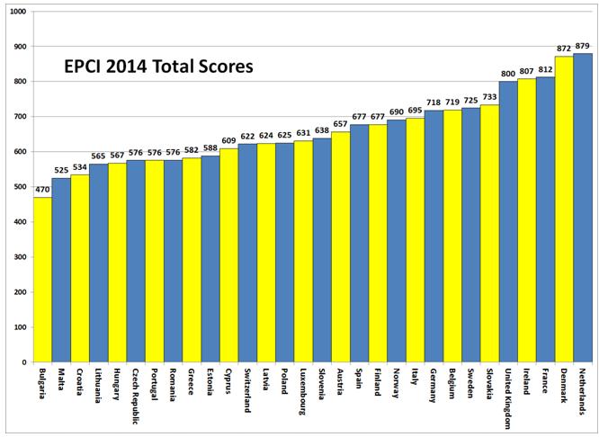 Όπως καταδεικνύουν οι εθνικοί δείκτες αναφοράς του EPCI, υπάρχει ένας ευρύς καταμερισμός των αποτελεσμάτων στον πίνακα, με έναν ασυνήθιστο συνδυασμό χωρών με υψηλό και μεσαίο εισόδημα στο άνω μισό των θέσεων κατάταξης.