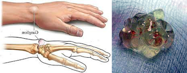 Στην ψηλάφηση φαίνεται σκληρό σαν κόκκαλο. Όμως στην πραγματικότητα είναι μια κύστη της άρθρωσης του καρπού που περιέχει υγρό της άρθρωσης, παχύρευστο, σαν μέλι (με μεγάλο ιξώδες).