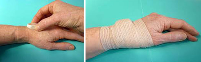 Ακινητοποιώντας τον καρπό, πλήττουμε απότομα το γάγγλιο με ένα βαρύ βιβλίο. Εάν δεν έχει παρέλθει πολύς χρόνος από την εμφάνισή του, ρηγνύεται το περίβλημα της κύστης, το υγρό εκχέεται στην άρθρωση και ιάται πλήρως. Μετά τη θραύση είναι σκόπιμο να επιδεθεί ο καρπός με ελαστικό επίδεσμο για 5 ημέρες.