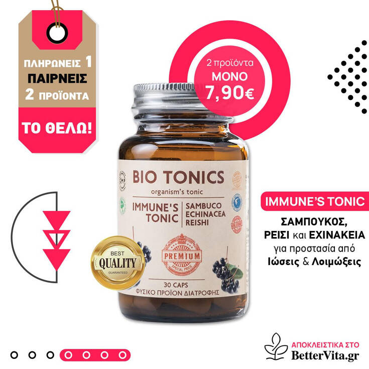 Το Immune’s Tonic θα το βρείτε αποκλειστικά στο BetterVita.gr μόνο στα 7,90 € (30 κάψουλες) που με την μοναδική προσφορά 1+1 ΔΩΡΟ θα σας βοηθήσει στην αντιμετώπιση των ιώσεων και της γρίπης τώρα που ο χειμώνας δείχνει τα δόντια του.