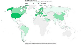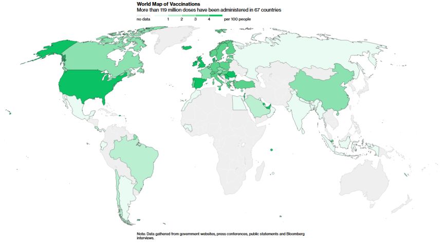 Καθώς 119 εκατ. δόσεις εμβολίων έχουν χορηγηθεί παγκοσμίως, τα στοιχεία του Bloomberg δείχνουν ότι κάποιες χώρες κάνουν πολύ πιο γρήγορη πρόοδο σε σχέση με άλλες.