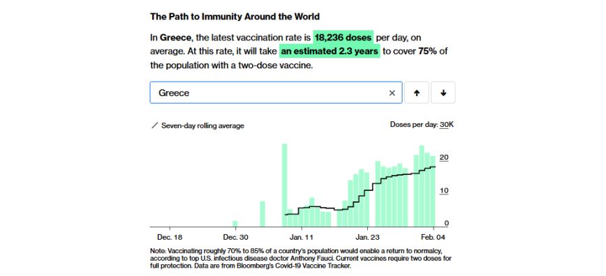 Η Ελλάδα θα χρειαστεί 2,3 χρόνια, σύμφωνα με τα στοιχεία, καθώς είναι μία από τις ευρωπαϊκές χώρες με την ταχύτερη πρόοδο στους εμβολιασμούς. Ενδεικτικά, η Γερμανία θα χρειαστεί 3,2 χρόνια, η Γαλλία 3,9 χρόνια, η Ιταλία 2,8 χρόνια, η Ισπανία 3,1 χρόνια, η Πορτογαλία 4 χρόνια, η Αυστρία 6,9 χρόνια, η Ολλανδία 4,3 χρόνια αλλά η Ελβετία 2 χρόνια.