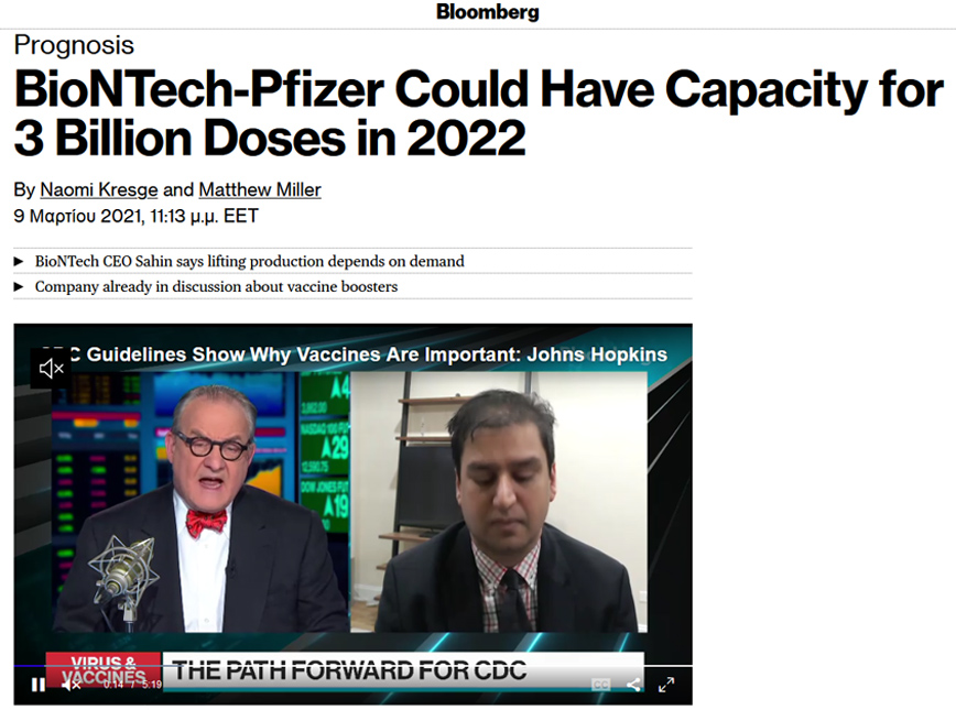 Tη δυνατότητα να παραγάγει 3 δισεκατομμύρια δόσεις του εμβολίου κατά της COVID-19 μπορεί να έχει το επόμενο έτος η Pfizer Inc/BioNTech, όπως μετέδωσε χθες το Bloomberg News, επικαλούμενο συνέντευξη που παραχώρησε ο διευθύνων σύμβουλος της γερμανικής εταιρείας βιοτεχνολογίας.