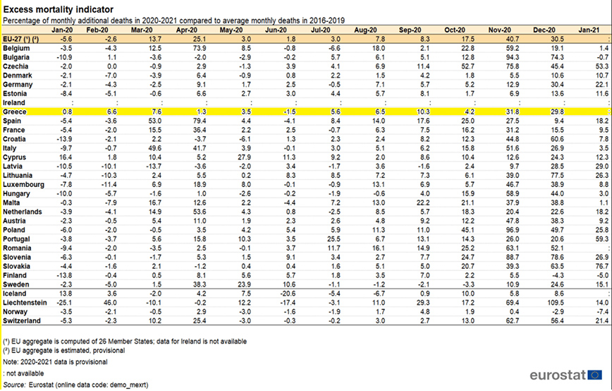 Συνολικά, η Eurostat υπολόγισε ότι στο διάστημα Μαρτίου – Δεκεμβρίου 2020, καταγράφηκαν στην Ευρωπαϊκή Ένωση 580.000 επιπλέον θάνατοι.