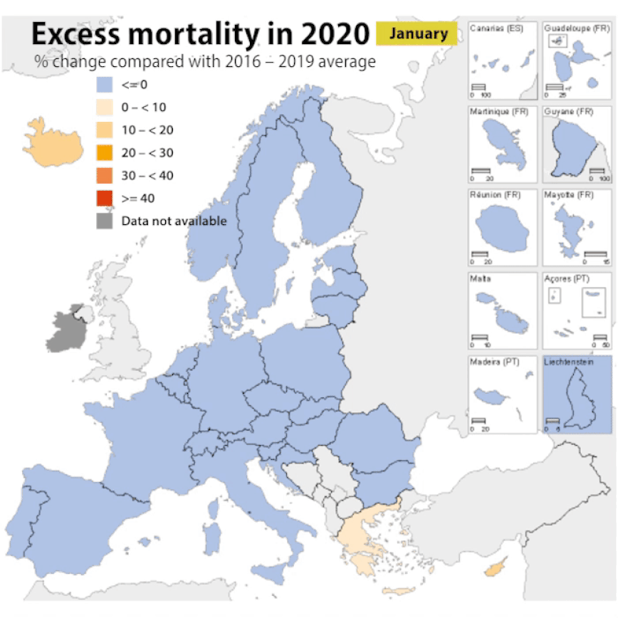 Συγκεκριμένα τον Απρίλιο του 2020 η θνησιμότητα στην Ευρωπαϊκή Ένωση κατέγραψε αύξηση 25% σε σύγκριση με το μέσο όρο του αντίστοιχου μήνα της περιόδου 2016 – 2019.
