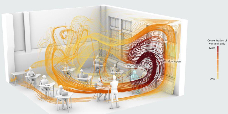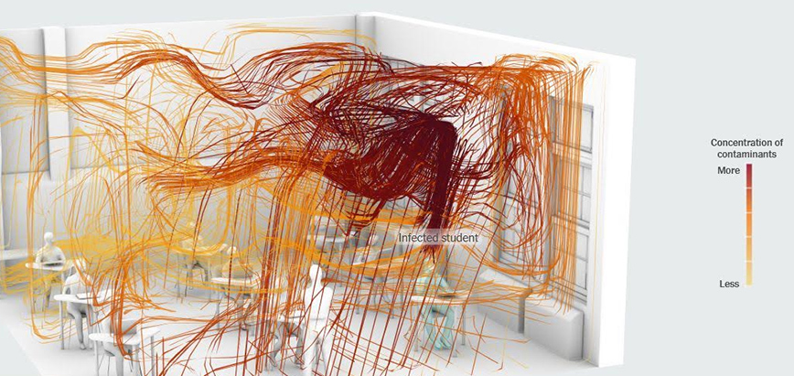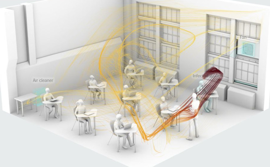 Εντυπωσιακά είναι τα γραφήματα που παρουσιάζει η γνωστή εφημερίδα New York Times για το πώς εξαπλώνεται ο κορονοϊός σε μια σχολική αίθουσα σε τρία διαφορετικά σενάρια: όταν τα παράθυρα είναι κλειστά, όταν είναι ανοιχτά και όταν υπάρχει σύστημα εξαερισμού στον χώρο.