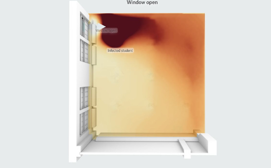 Στο δεύτερο σενάριο όταν ένα παράθυρο παραμένει ανοιχτό ο αέρας διαλύει τα μολυσμένα αερολύματα καθώς κινούνται στην αίθουσα, μειώνοντας έτσι τη διασπορά.