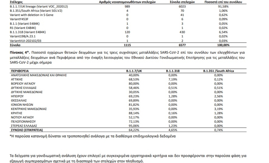 Επί του συνόλου των ελεγχθέντων για μεταλλάξεις εγχώριων δειγμάτων, οι τρεις πιο συχνές μεταλλάξεις που έχουν απομονωθεί είναι η Β.1.1.7/UK lineage (Variant VOC_202012), με ποσοστό 64,22%,ακολουθούμενη από τη B.1.1.318 (Variant_E484K) με ποσοστό 4,65% και τη B.1.351/South Africa (Variant 501.V2) με ποσοστό 0,74%. Επιπλέον, έχουν απομονωθεί συνολικά 88 στελέχη με μεταλλάξεις από εισαγόμενα δείγματα, εκ των οποίων 86 αφορούν τη μετάλλαξηΒ.1.1.7/UK lineage (Variant VOC_202012) και 2 αφορούν τη μετάλλαξη B.1.351/South Africa (Variant 501.V2).