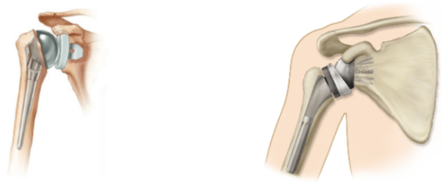 Ανάστροφη ολική αρθροπλαστική ώμου: Στην ανάστροφη ολική αρθροπλαστική, η τοποθέτηση των εμφυτευμάτων γίνεται αντίστροφα από την φυσιολογική ανατομία. Τοποθετείται, δηλαδή, μία στρογγυλή κεφαλή στην περιοχή της ωμογλήνης, ενώ το κοίλο τμήμα της τεχνητής πρόθεσης εισέρχεται στο βραχιόνιο.