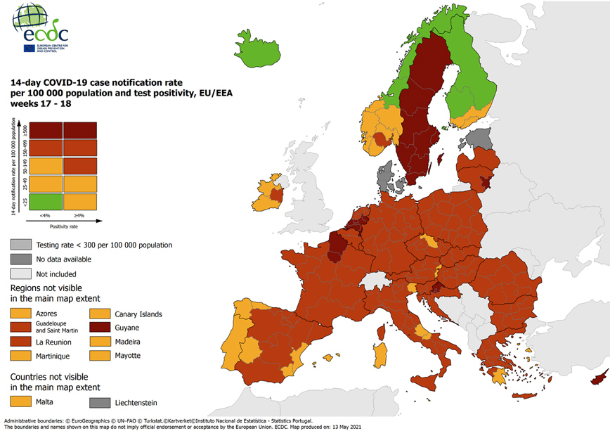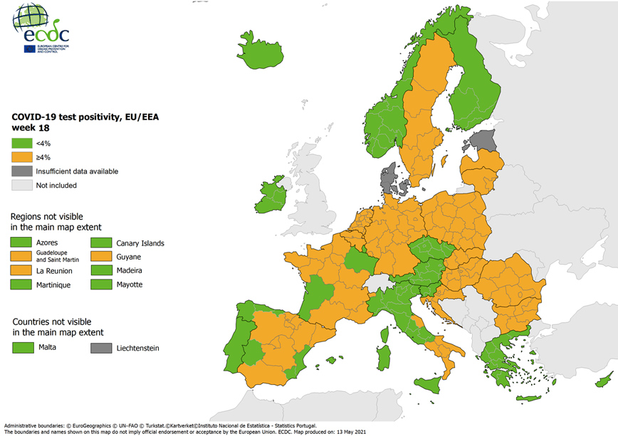 Στο «πράσινο» βρίσκεται η χώρα μας στον δείκτη θετικότητας σύμφωνα με τους αναθεωρημένους χάρτες του Ευρωπαϊκού Κέντρου Πρόληψης και Ελέγχου Νόσων (ECDC) που δημοσιεύθηκαν σήμερα Πέμπτη (13/5).