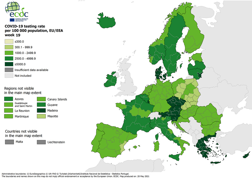 Στο «πράσινο» συνεχίζει για ακόμα μια εβδομάδα να βρίσκεται η χώρα μας στον δείκτη θετικότητας σύμφωνα με τους αναθεωρημένους χάρτες του Ευρωπαϊκού Κέντρου Πρόληψης και Ελέγχου Νόσων (ECDC) που δημοσιεύθηκαν σήμερα Πέμπτη (20/5).