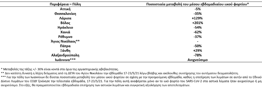Συγκεκριμένα την εβδομάδα 17-23 Μαΐου 2021, παρατηρήθηκαν πτωτικές ή σταθεροποιητικές τάσεις, σε σχέση με την εβδομάδα 10-16 Μαΐου 2021, στο ιικό φορτίο του SARS-CoV-2 στα αστικά λύματα των επτά από τις δώδεκα (7/12) περιοχές που ελέγχονται από το Εθνικό Δίκτυο Επιδημιολογίας Λυμάτων του ΕΟΔΥ.