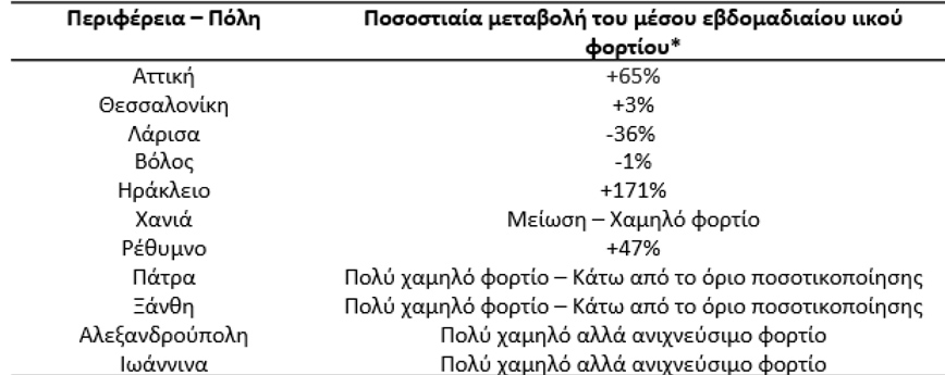 Συγκεκριμένα η Αττική έχει αύξηση 65%, το Ηράκλειο 171% και το Ρέθυμνο 47%. Παράλληλα μικρή αύξηση έχει η Θεσσαλονίκη με 3%, ενώ μείωση καταγράφει η Λάρισα με -36% και ο Βόλος με -1%.