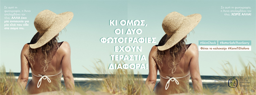 Η νέα εκστρατεία ενημέρωσης της ΕΔΑΕ τονίζει τη σημασία να ελέγχουμε τακτικά το δέρμα μας και να επισκεπτόμαστε τον Δερματολόγο μας μία φορά το χρόνο. Και μας θυμίζει ότι με πολύ μικρές κινήσεις, μπορούμε να κάνουμε τη διαφορά στην πρόληψη του καρκίνου του δέρματος και του μελανώματος!