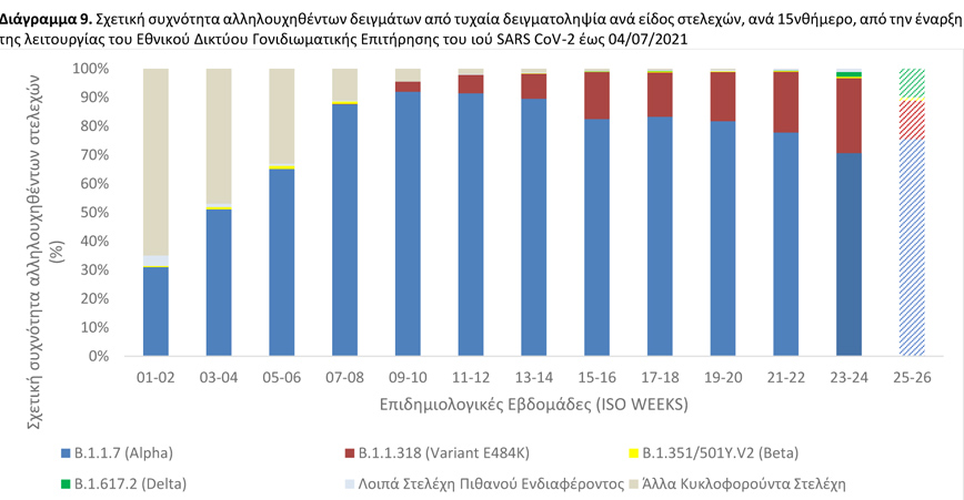 Η διαχρονική εξέλιξη της σχετικής συχνότητας των αλληλουχηθέντων δειγμάτων από τυχαία δειγματοληψία ανά είδος στελεχών απεικονίζεται στο Διάγραμμα 9 μέχρι και την εβδομάδα 24, ενώ δίνονται επιπλέον προσωρινά στοιχεία για τις εβδομάδες 25-26.