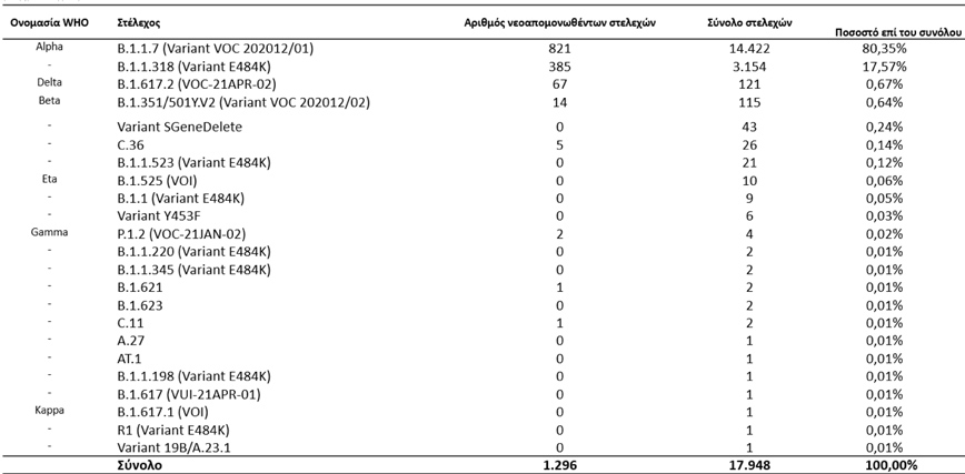 Από τον έλεγχο των 1.372 δειγμάτων, αναδείχθηκαν συνολικά 904 δείγματα με στελέχη ειδικού ενδιαφέροντος (Variants Of Concern – VOC), 390 δείγματα με στελέχη υπό παρακολούθηση (Variants Under Monitoring) και 1 δείγμα με στέλεχος ενδιαφέροντος (Variant of Interest – VOI).