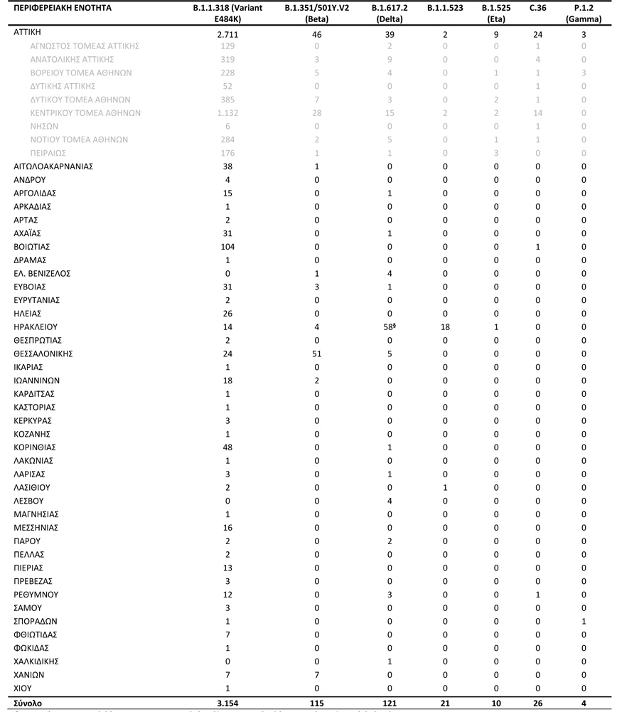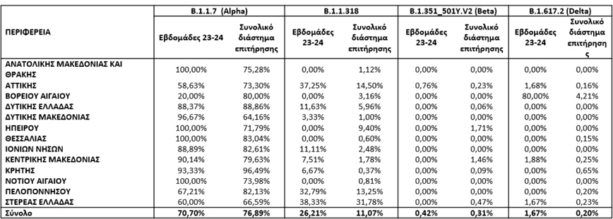 Από τα δείγματα αυτά, 21,38% αφορούν στο στέλεχος Alpha, 62,34% στο B.1.1.318 (Variant E484K), 3,35% στο Beta, 3,94% στο Delta και 0,27% στο C.36.