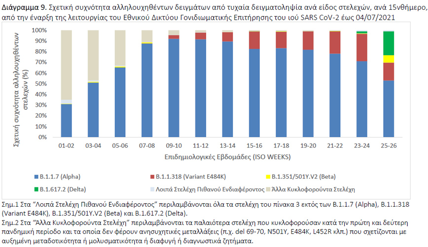 Η διαχρονική εξέλιξη της σχετικής συχνότητας των αλληλουχηθέντων δειγμάτων από τυχαία δειγματοληψία ανά είδος στελεχών, μέχρι και την εβδομάδα 26 απεικονίζεται στο Διάγραμμα 9.