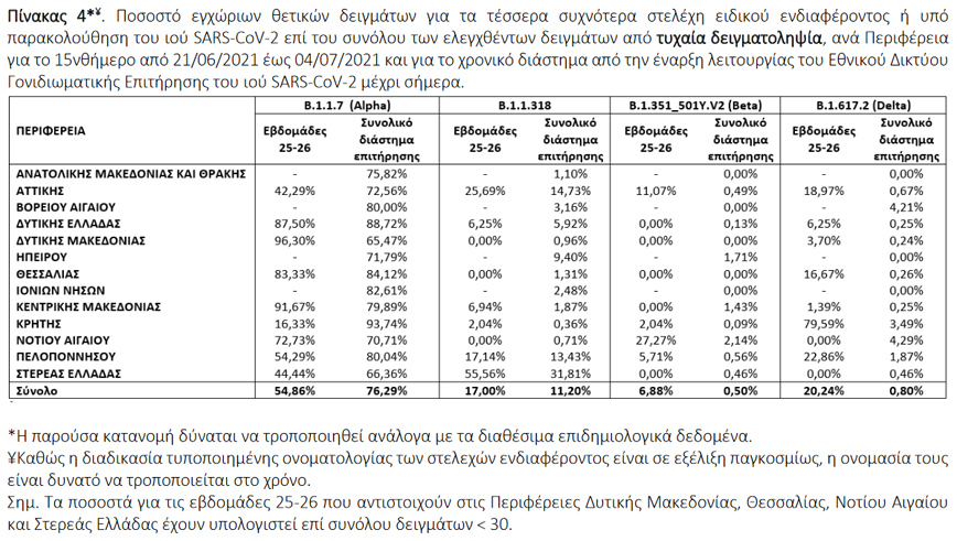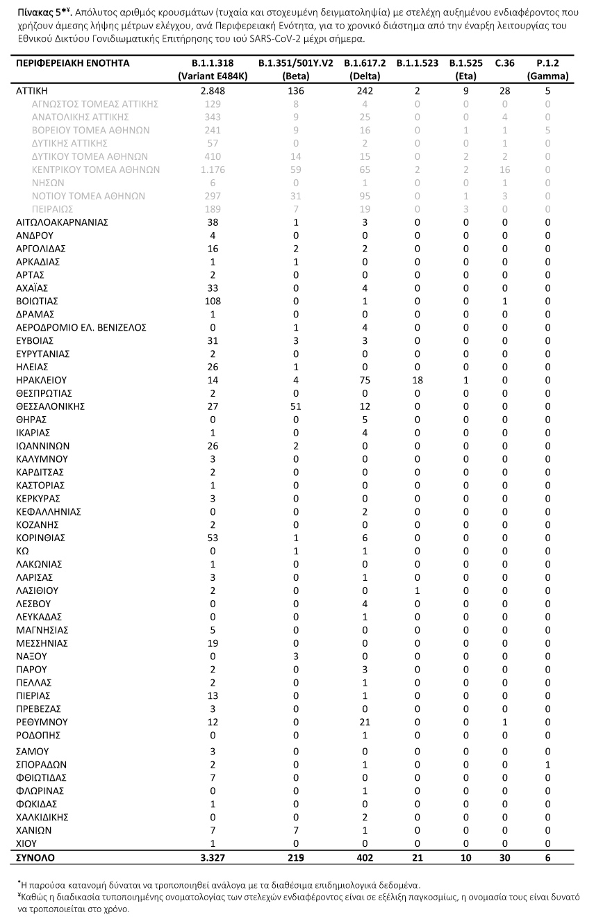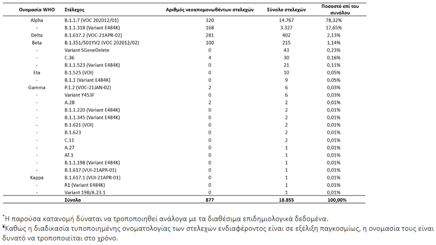 Εκ των 703 δειγμάτων με στελέχη ειδικού ενδιαφέροντος, τα 320 αφορούν στο στέλεχος Alpha, 100 αφορούν στο Βeta, 281 αφορούν στο Delta και 2 αφορούν στο Gamma.