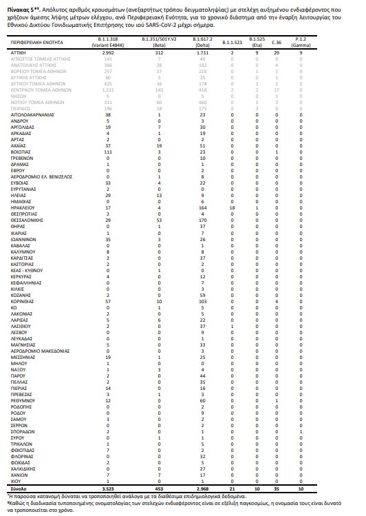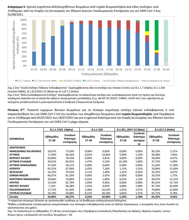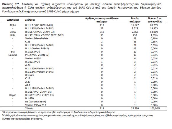 Εκ των 683 δειγμάτων με στελέχη ειδικού ενδιαφέροντος, τα 540 αφορούν στο στέλεχος Delta, 113 αφορούν στο Alpha και 30 αφορούν στο Βeta.