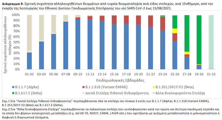 Η διαχρονική εξέλιξη της σχετικής συχνότητας των αλληλουχηθέντων δειγμάτων από τυχαία δειγματοληψία ανά είδος στελεχών, μέχρι και την εβδομάδα 30 απεικονίζεται στο Διάγραμμα 9, ενώ δίνονται επιπλέον προσωρινά στοιχεία για τις εβδομάδες 31-32.
