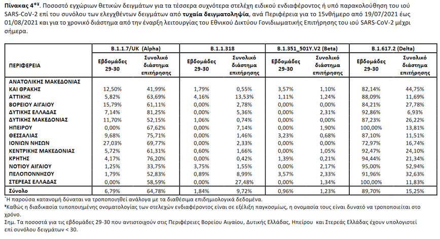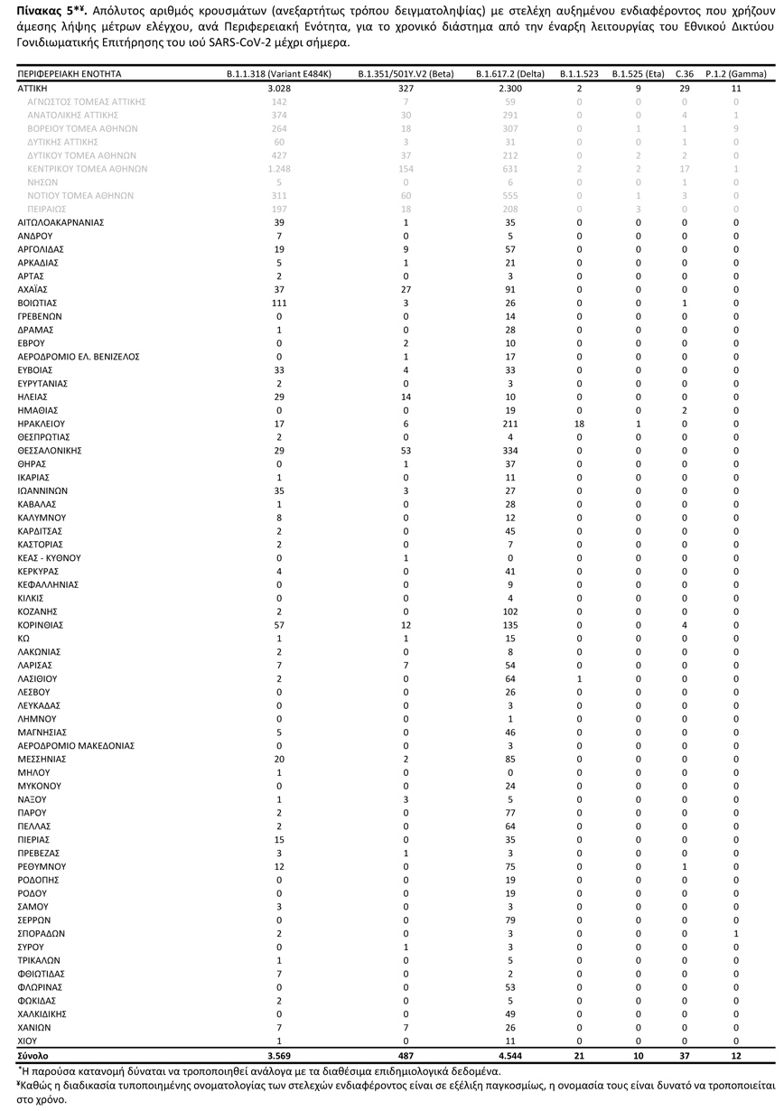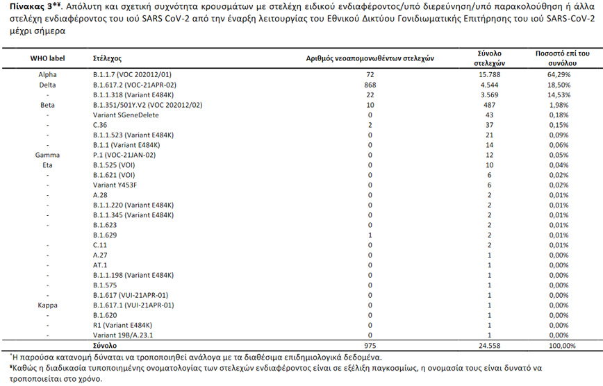 Εκ των 950 δειγμάτων με στελέχη ειδικού ενδιαφέροντος, τα 868 αφορούν στο στέλεχος Delta, 72 αφορούν στο Alpha και 10 αφορούν στο Βeta.