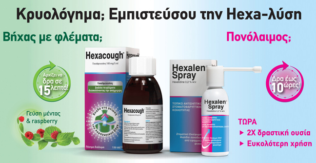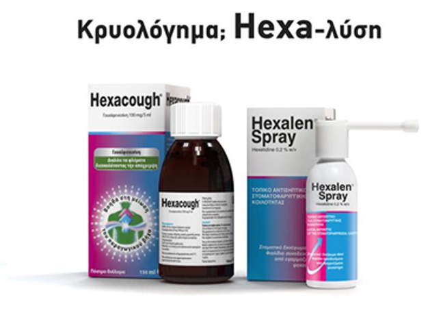 Τα συμπτώματα του κρυολογήματος, όπως ο πονόλαιμος και ο παραγωγικός βήχας, έχουν ως αποτέλεσμα να ταλαιπωρούν ένα μεγάλο ποσοστό του πληθυσμού κάθε χρόνο, ιδιαίτερα τον χειμώνα δυσκολεύοντας τις καθημερινές τους δραστηριότητες. Η οικογένεια Hexalen® όμως, έχει τη λύση για τη θεραπεία των 2 πιο συχνών συμπτωμάτων …. Την Hexa-λύση!