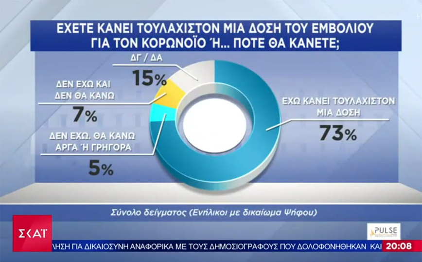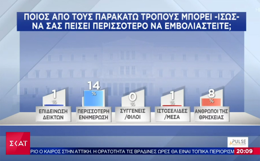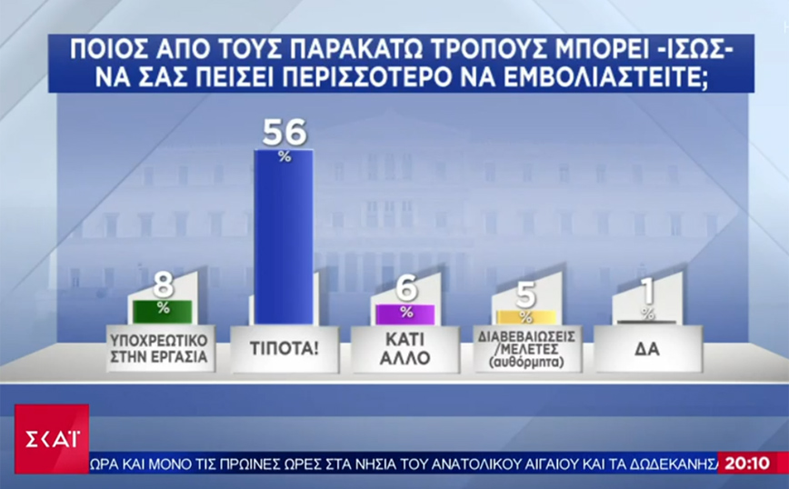 Σύμφωνα με δημοσκόπηση του ΣΚΑΪ, το 56% των πολιτών που δεν δέχονται να εμβολιαστούν, απαντώντας σε σχετική ερώτηση, ξεκαθαρίζουν ότι τίποτα δεν πρόκειται να τους μεταπείσει.