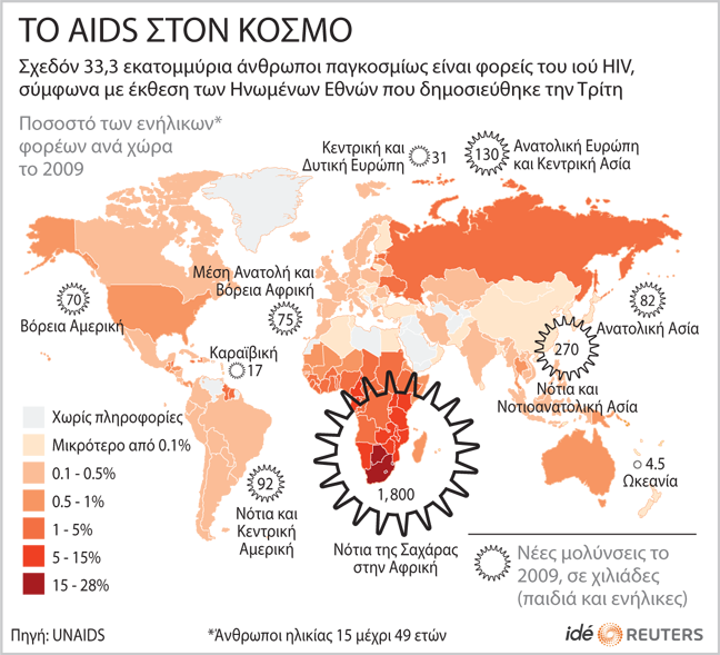 Σύμφωνα με μια μελέτη των Ηνωμένων Εθνών που είδε το φως της δημοσιότητας χτες, εκτιμάται ότι περίπου 33 εκατ. άνθρωποι παγκοσμίως είναι φορείς του ιού HIV, που προκαλεί το AIDS. Ωστόσο, όπως δήλωσε ο εκτελεστικός διευθυντής της UNAIDS, Μισέλ Σιντιμπέ, για πρώτη φορά υπάρχουν ενδείξεις ότι έχει αρχίσει μια πτωτική τάση στην πορεία της επιδημίας.» Λιγότεροι άνθρωποι μολύνονται από τον ιό και λιγότεροι πεθαίνουν από την ασθένεια» είπε χαρακτηριστικά.