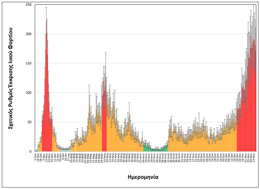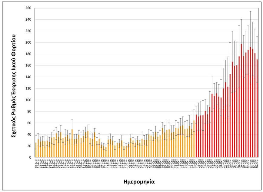 Όπως φαίνεται στα διαγράμματα που παρουσιάζει το ΑΠΕ-ΜΠΕ, στις 9 Νοεμβρίου μετρήθηκε η υψηλότερη συγκέντρωση ιικού φορτίου του τρέχοντος κύματος της πανδημίας και οι επόμενες επτά μετρήσεις -μέχρι και τις 16 Νοεμβρίου- κυμάνθηκαν γύρω από αυτό το επίπεδο, χωρίς να το υπερβαίνουν.