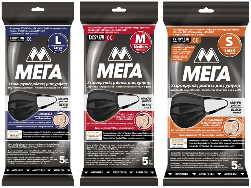 Οι νέες μαύρες χειρουργικές μάσκες προσώπου ΜΕΓΑ Type IIR, έχουν σχεδιαστεί σύμφωνα με πολύ αυστηρά κριτήρια ποιότητας προκειμένου να εξασφαλίζουν αποδεδειγμένη αποτελεσματικότητα και εξαιρετικά υψηλή προστασία.