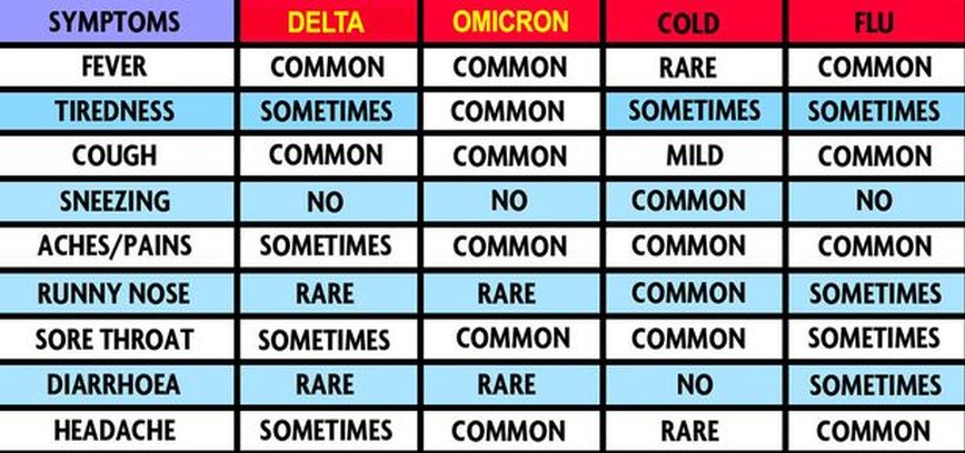 Σύμφωνα με έναν πίνακα που παρουσιάζει η Mirror, αναφέρονται τα εξής συμπτώματα: Πυρετός, κόπωση, βήχας, φτέρνισμα, πόνος, ρινική καταρροή, πονόλαιμος, διάρροια, πονοκέφαλος.