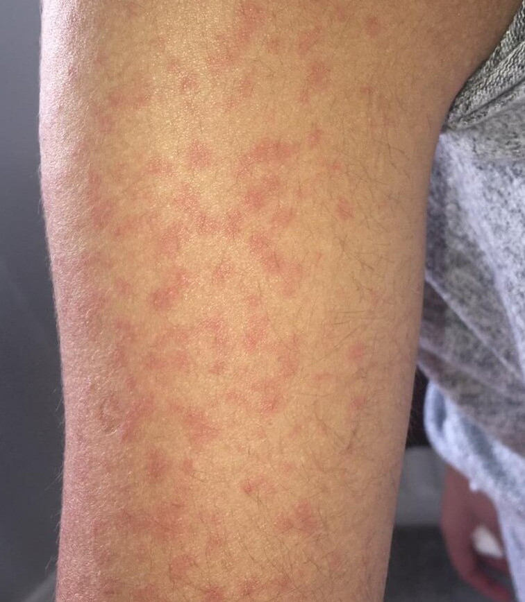 Το πρώτο είναι ένα εξάνθημα με μικρά εξογκώματα που εμφανίζεται ξαφνικά και το οποίο προκαλεί έντονη φαγούρα, ενώ μπορεί να εξαφανιστεί σε μερικές ώρες. Είναι πιθανό μάλιστα να ξεκινήσει με έντονη φαγούρα σε πέλματα και παλάμες.