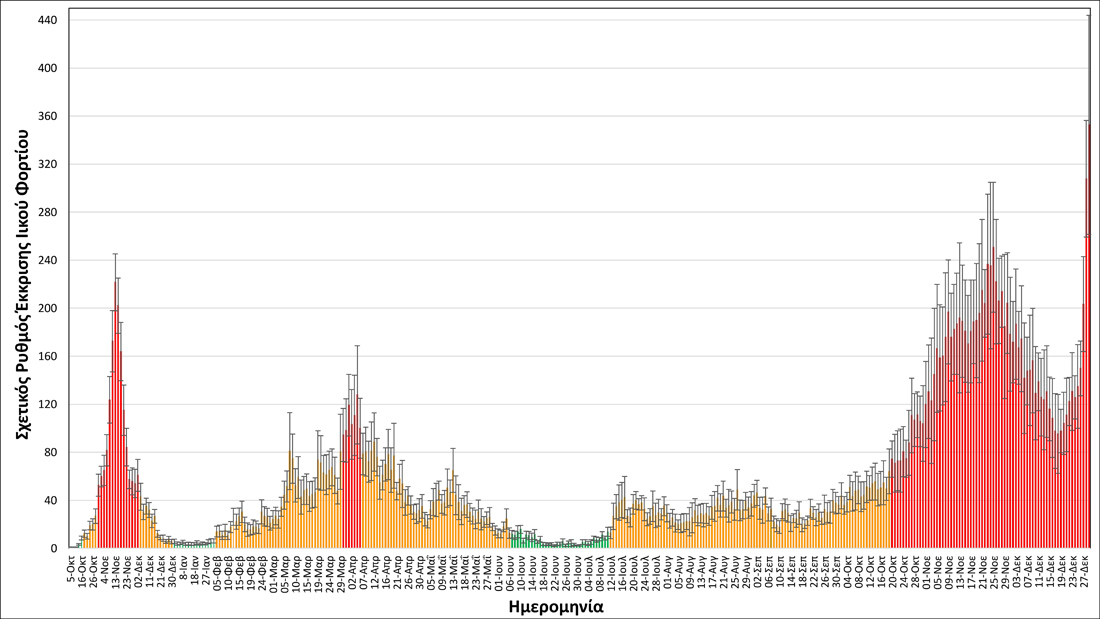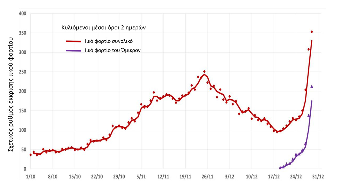 Από τις αναλύσεις καθημερινών δειγματοληψιών λυμάτων που αφορούν το διάστημα 19/12 έως τις 29/12 προκύπτει ότι το ιικό φορτίο του στελέχους Όμικρον διπλασιάζεται ανά 1,86 ημέρες.