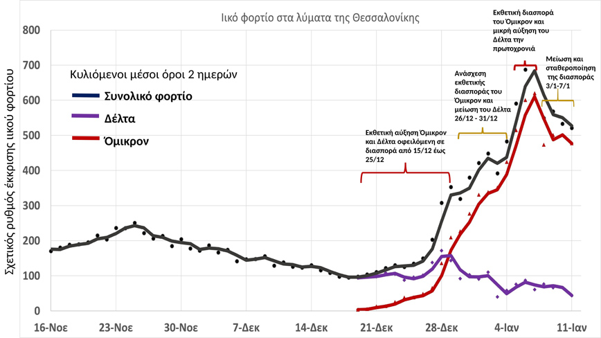 Σε ό,τι αφορά την εξέλιξη του ιικού φορτίου των στελεχών Όμικρον και Delta του SARS-CoV-2, ο αναπληρωτής καθηγητής Μοριακής Μικροβιολογίας του Τμήματος Κτηνιατρικής ΑΠΘ Χρυσόστομος Δόβας εξήγησε: «Διαχρονικά και με βάση τα δεδομένα που έχουμε από το διάστημα που μεσολαβεί μεταξύ σημαντικών γεγονότων διασποράς στην κοινότητα και αύξησης στη συνέχεια του φορτίου στα λύματα της Θεσσαλονίκης, εκτιμούμε ότι για το στέλεχος Όμικρον οι αναλύσεις των λυμάτων υποδηλώνουν το μέγεθος της διασποράς του στην κοινότητα 4-5 ημέρες στο παρελθόν. Οι καταγραφές που έχουμε από 8/1 και μετά καταδεικνύουν σταθεροποίηση του ιικού φορτίου στην κοινότητα σε υψηλά επίπεδα, με το Δέλτα να μειώνεται με αργούς ρυθμούς. Με βάση και τη μέτρηση στις 11/1, το ιικό του φορτίο του Δέλτα στην πόλη έχει μειωθεί στο μισό σε σχέση με τις 19/12 όταν ανιχνεύθηκε το Όμικρον για πρώτη φορά».