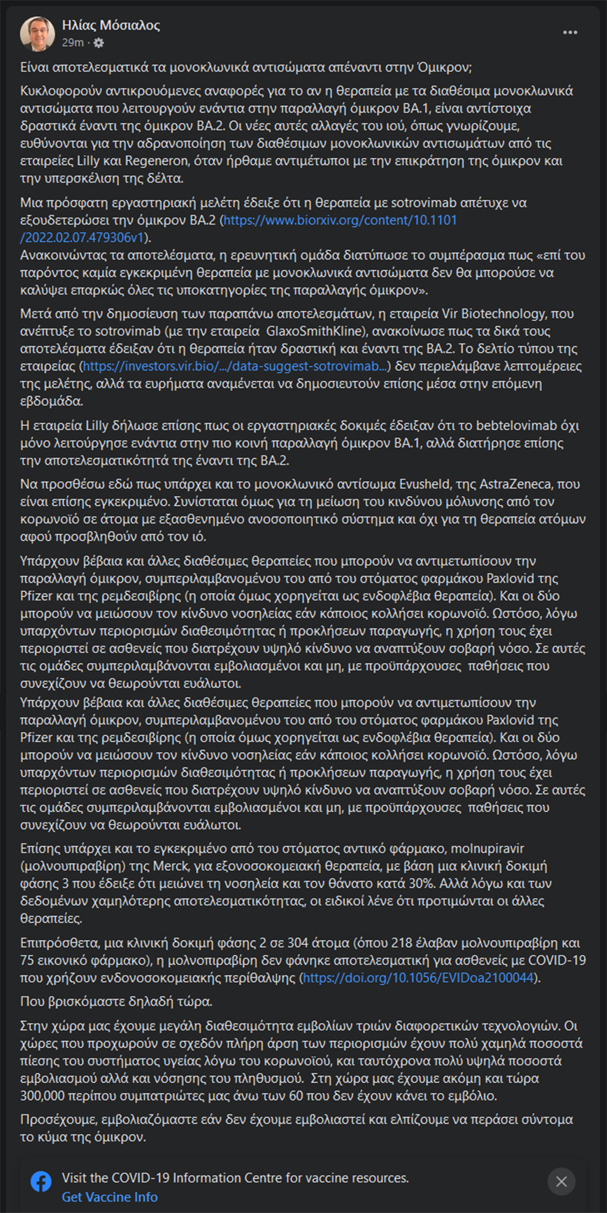 Για την αποτελεσματικότητα των μονοκλωνικών αντισωμάτων και φαρμάκων απέναντι στη μετάλλαξη Όμικρον μιλά ο Ηλίας Μόσιαλος, σε ανάρτησή του στο Facebook.