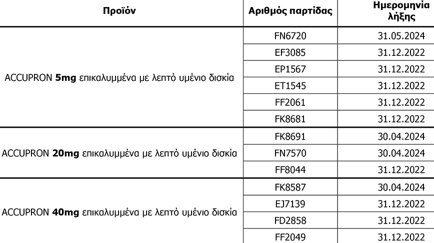 Την ανάκληση των παρτίδων (δείτε στον παρακάτω πίνακα) του φαρμακευτικού προϊόντος «ACCUPRON Δισκία επικαλυμμένα με λεπτό υμένιο 5, 20 ή 40 mg/tab», λόγω υπέρβασης του ορίου της αποδεκτής ημερήσιας πρόσληψης για την πρόσμιξη Ν-νιτροζο-κιναπρίλη (N-nitroso-quinapril).