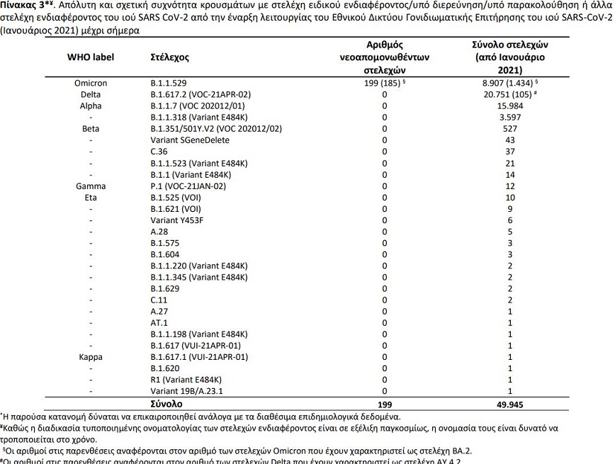 Επιπλέον, έχουν απομονωθεί συνολικά 679 στελέχη ειδικού ενδιαφέροντος ή υπό παρακολούθηση ή ενδιαφέροντος από δείγματα εισαγόμενων κρουσμάτων, εκ των οποίων 336 αφορούν στο Delta, 209 στο Omicron, 113 στο Alpha, 7 στο Mu, 6 στο Beta, 4 στο B.1.1.318 (Variant E484K), 1 στο Eta, 1 στο C.36, 1 στο Kappa, και 1 στο B.1.1 (Variant E484K).