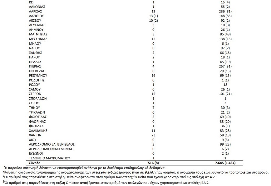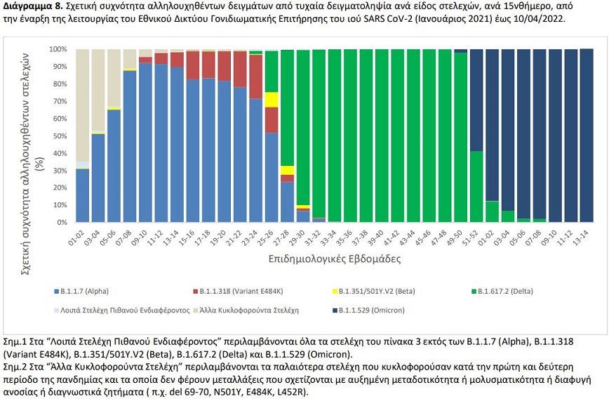 Σύμφωνα με τον ΕΟΔΥ στη πρόσφατη ανακοίνωση του για τα κρούσματα του ιού στην Ελλάδα, αναφέρει πως ολοκληρώθηκε από το Εθνικό Δίκτυο Γονιδιωματικής Επιτήρησης του ιού SARS-CoV-2, που λειτουργεί υπό το συντονισμό του ΕΟΔΥ, η γονιδιωματική ανάλυση σε 209 δείγματα που έχουν επιλεγεί τυχαιοποιημένα ή στοχευμένα και αφορούν στην περίοδο 16 Φεβρουαρίου 2022 έως 12 Απριλίου 2022. Από τον έλεγχο των 209 δειγμάτων, αναγνωρίστηκαν συνολικά 199 δείγματα με στελέχη ειδικού ενδιαφέροντος (Variants Of Concern – VOC), όλα Omicron (B.1.1.529). Επίσης, 185 από τα 199 στελέχη Omicron αφορούσαν στο στέλεχος ΒΑ.2 (93%, ενώ την προηγούμενη εβδομάδα το αντίστοιχο ποσοστό ήταν 77%).