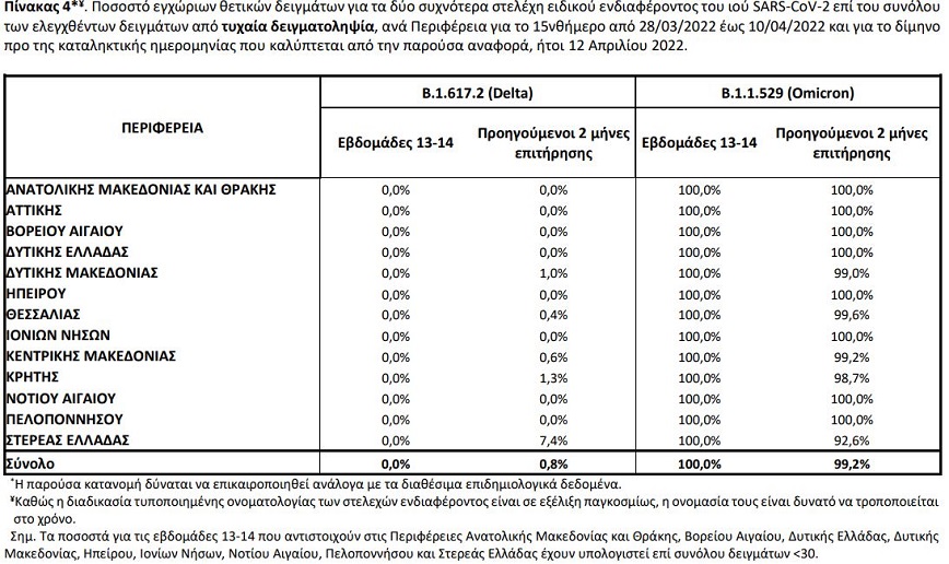 Κατά τη διάρκεια του διμήνου πριν τις 12 Απριλίου 2022, είχαν ελεγχθεί στην επικράτεια συνολικά 2.695 δείγματα από εγχώρια κρούσματα. Εξ’ αυτών 2.594 προέρχονται από τυχαία επιλογή δειγμάτων και 101 από στοχευμένη λήψη ή επιλογή δειγμάτων. Μεταξύ των 2.594 τυχαία επιλεγμένων δειγμάτων στην επικράτεια που αφορούν το δίμηνο πριν τις 12 Απριλίου 2022, τα δύο πιο συχνά στελέχη ειδικού ενδιαφέροντος που έχουν απομονωθεί είναι το Omicron με ποσοστό 99,2%, ακολουθούμενο από το Delta με ποσοστό 0,8%. Μεταξύ των 101 δειγμάτων που έχουν ληφθεί ή επιλεγεί στοχευμένα κατά τη διάρκεια του διμήνου πριν τις 12 Απριλίου 2022, 92,1% αφορούν το στέλεχος Omicron και 7,9% στο στέλεχος Delta.