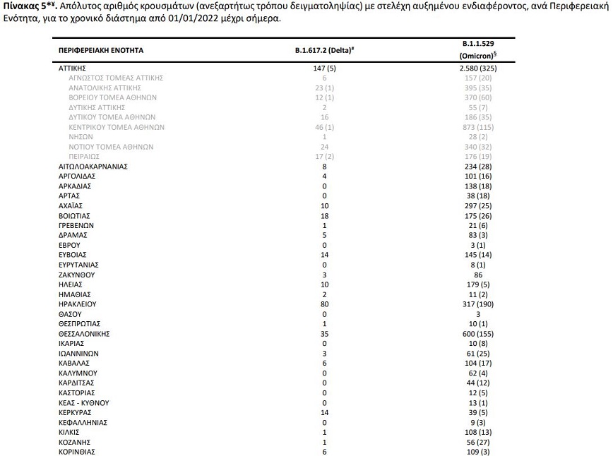 Απόλυτος αριθμός κρουσμάτων (ανεξαρτήτως τρόπου δειγματοληψίας) με στελέχη αυξημένου ενδιαφέροντος, ανά Περιφερειακή Ενότητα, για το χρονικό διάστημα από 01/01/2022 μέχρι σήμερα: