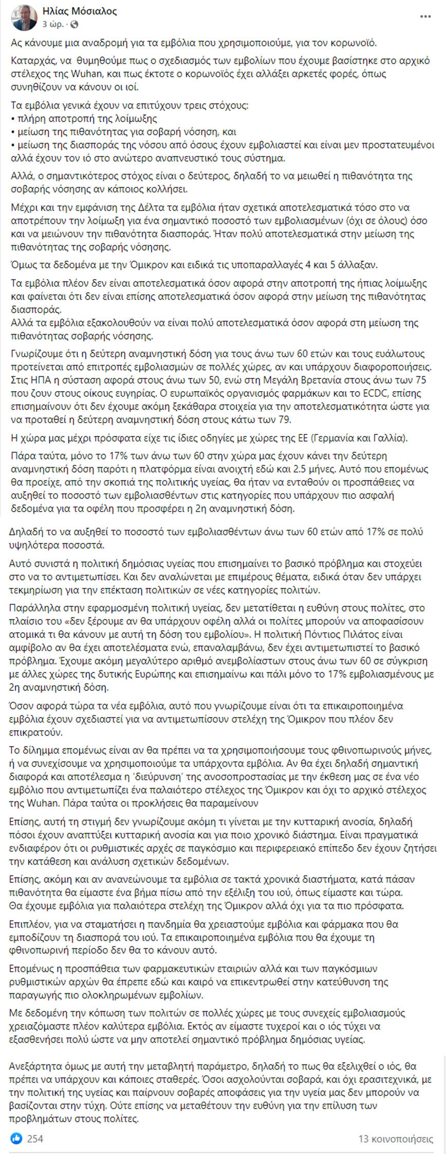 Αναδρομή στην εξέλιξη του κορονοϊού και στα εμβόλια που χρησιμοποιήθηκαν έκανε ο Ηλίας Μόσιαλος μέσω του προσωπικού του λογαριασμού στο facebook. Ο καθηγητής Πολιτικής της Υγείας του LSE αναφέρθηκε στους τρεις στόχους των εμβολίων, την αποτελεσματικότητα τους, τις μεταλλάξεις και το γεγονός πως «Κατά πάσαν πιθανότητα θα είμαστε ένα βήμα πίσω από την εξέλιξη του ιού» ενώ τόνισε πως «η πανδημία θα σταματήσει μόνο με ολοκληρωμένα εμβόλια».