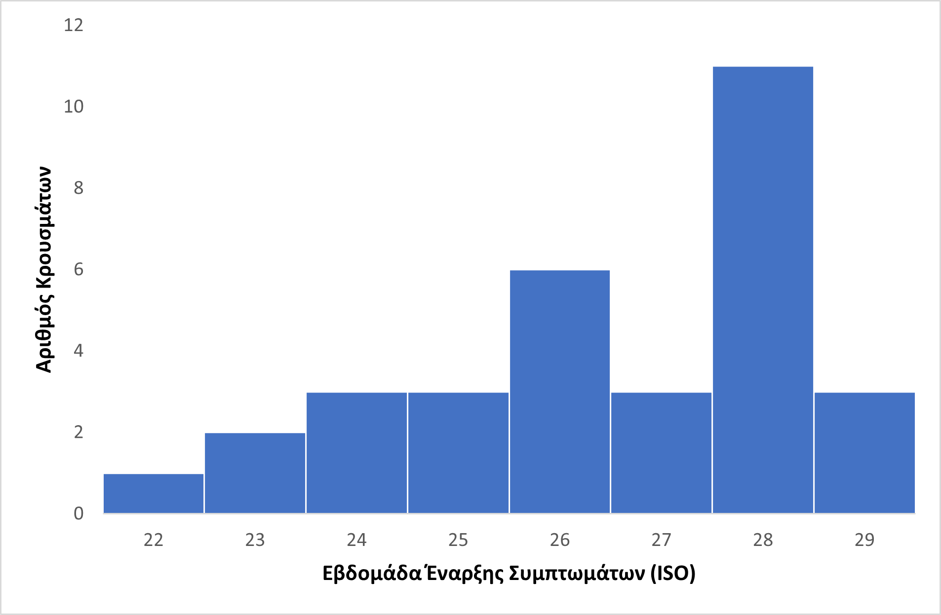 Η χρονική κατανομή των εργαστηριακά επιβεβαιωμένων κρουσμάτων ανά εβδομάδα έναρξης συμπτωμάτων (εβδομάδα κατά ISO) παρουσιάζεται στο Γράφημα 1.